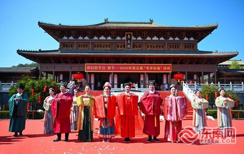 我们的节日•春节——2026年第五届“考亭祈福”活动在建阳考亭书院举行 张行健 摄 东南网2月22日讯(本网记者 郑正华 通讯员 庄妍 刘剑锋)2月21日,正月初五,主题为“穿汉服过大年・拜文公祈福运”的我们的节日•春节——2026年第五届“考亭祈福”活动在建阳考亭书院举行。 上午10点,大鼓敲响,经幡开道,由道南汉服、北京华研会、欧洲汉服协会等20多家汉服机构组成仪仗队正式入场。主祈福官恭诵《祈福文》,向文公朱子圣像敬酒、献芹、行揖礼,并带领所有人员敬拜文公。闽北历史名人“穿越”献祝福,社会各界代表依次祈福。嘉宾、市民、游客在司仪引导下,走进考亭书院集成殿,向朱子像敬献桂枝,祈愿国泰民安、幸福安康。
