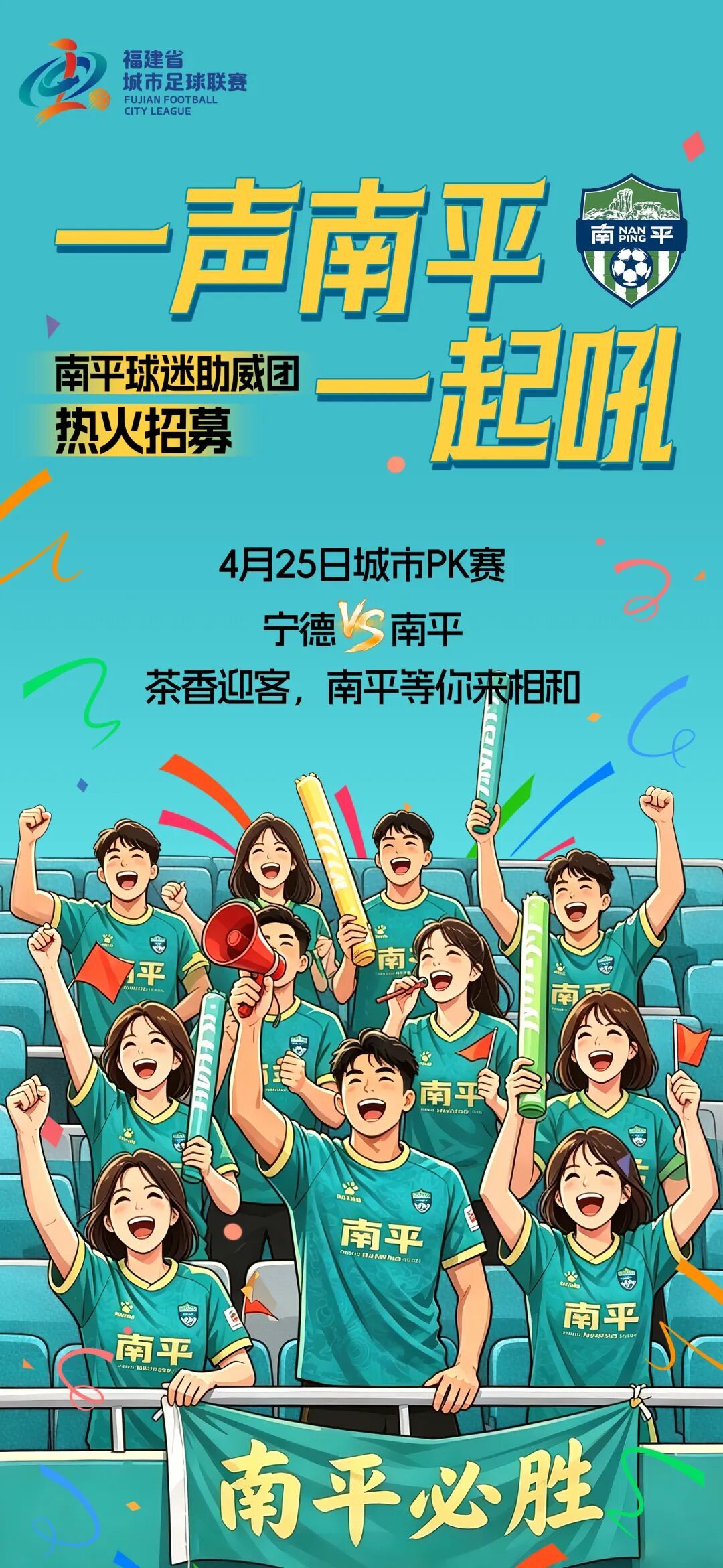 比赛地点 宁德市体育中心体育场 (具体看台方阵位置后续公布) 2026年福建省城市足球联赛(简称“闽超”)战火即将燃遍八闽大地。经过数月的精心筹备,代表闽北足球最高水平的南平队已集结完毕,即将踏上首届闽超的征途。南平市足球协会现正式启动南平球迷助威团招募工作,开启4月25日首轮远征宁德比赛远征助威团团购,快扫码加群抢购! 远征团购信息 团购时间 4月16日起 团购方式 扫描以下对应县市二维码进群抢购~ 费用标准 51.3元/人 限量名额 700人(报满即止) 团购费用包含 ✅ 南平-宁德往返大巴车费(正规旅游大巴,含高额座位险) ✅ 首轮客场球票(专属南平助威团区域) ✅ 定制助威服1件 ✅ 赛事补给物资包 ✅ 个人意外保险(一日出行险,全程保障) 团购报名条件 1.年龄18-55周岁,男女不限; 2.身体健康,无心脏病、高血压等不适宜高强度呐喊、长时间观赛的疾病; 3.具备团队意识,能适应赛场助威节奏,积极配合统一指挥; 4.承诺观赛期间主动呐喊、声音洪亮、热情饱满,同步完成口号、手势等互动环节,共同营造沉浸式主场氛围,让南平队的客场变主场! 团购报名须知 1. 信息填报:请准确填写每位成员的姓名、身份证号码、联系电话,确保信息真实、完整且与参与人身份一致,切勿重复购买门票。 2.上车区域选择:报名时请根据方便原则,在以下地点就近选择上车区域。 延平区:商业城黄金中心(延平区-胜利街南平市延平区医院北侧约110米) 建阳区:南平市体育中心(建阳区建平大道与双龙路交汇处东北侧) 建瓯市:建瓯市体育中心(建瓯市瓯宁路7号) 政和县:政和县实验小学(政和县朝阳街1号) 3.实名要求:报名人须为助威团实际成员,严禁代报或信息不符。现场需人、证、票三合一入场。 4.审慎缴费:因涉及大巴、球票、物资及保险的提前预定与采购,请确认行程无误后再支付。费用一经收取,概不退换。 购票重要提示 1.名额告知:若客场助威团名额已满,未能报上的球迷朋友请密切关注“福建武夷体育产业集团”公众号发布的后续主场赛事票务信息。南平队首个主场赛事将于5月3日在南平市体育中心举行,对阵莆田队,欢迎届时回家看球! 2.行动纪律:助威团须统一穿着助威服、统一行动,观赛期间严禁个人私自脱离队伍,严禁穿着其他俱乐部球衣入场,以确保安全和助威效果。 3.信息用途:您提交的信息将仅用于购买保险、实名制票务及紧急联络,请放心填写。 4.文明观赛:请自觉遵守观赛礼仪,为双方精彩表现喝彩,理智对待比赛结果,抵制任何形式的谩骂与起哄,散场时自觉带走垃圾,展现南平球迷懂球、爱球、文明的专业素养。 特别鸣谢 本次远征助威团组织工作得到了2026福建省城市足球联赛南平赛区组委会、南平市体育局、福建武夷体育产业集团有限公司、南平市足球协会、南平各县(市、区)足球协会的鼎力支持与保障,力求为各位球迷提供安全、有序、激情澎湃的客场征程! 闽超联赛将于4月19日打响。4月25日,宁德客场——南平队的第一战,也是我们的第一战。穿上助威服,站上客队看台,用喊声告诉所有人:闽北足球,从来不怕客场。700个名额,报满即止!快扫描下方二维码进群抢购吧~